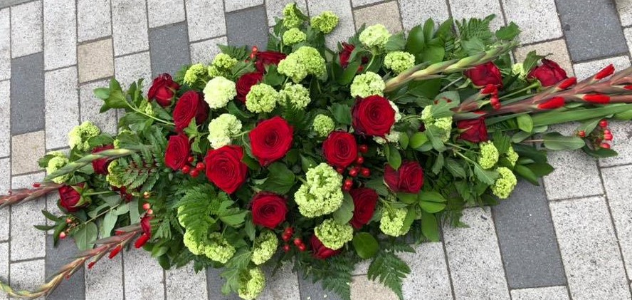 A Coffin Spray or Casket Spray is often chosen by close family members as one of the main floral tributes. A spray is designed with a large flat base to allow the flowers to sit beautifully and securely on the coffin.