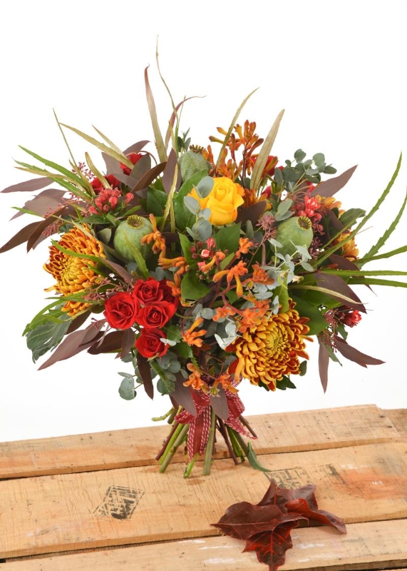 A rich harvest of large orange blooms with roses, poppy seed heads and seasonal red and oranges flowers for an autumn feast in a handtied bouquet.