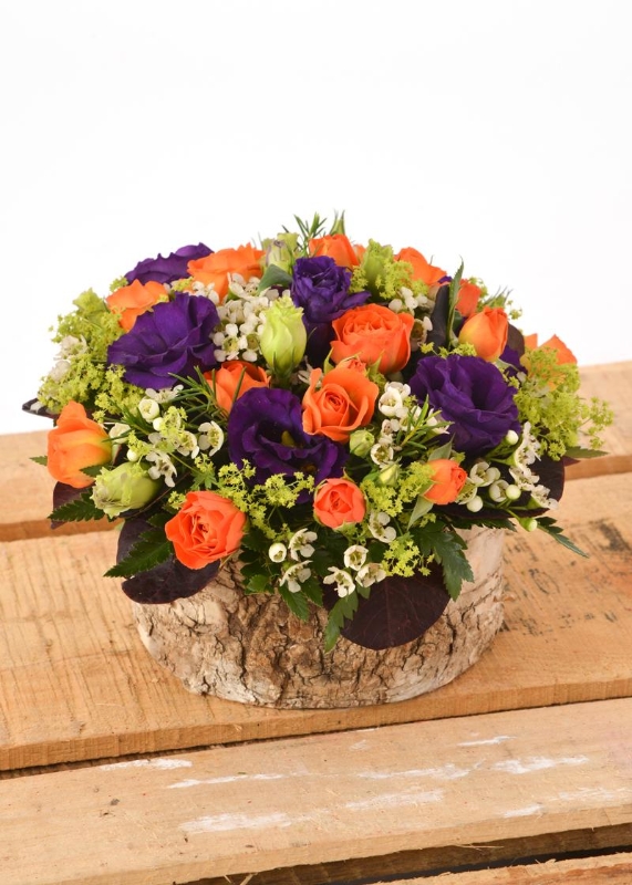 Reflecting the trend for natural material this bark container is filled with burnt orange and vivid purple flowers.